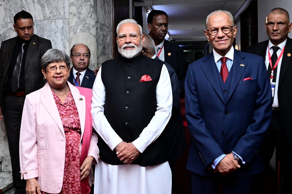 Honourable Shirin Aumeeruddy Cziffra, Speaker of the National Assembly, welcoming His Excellency Emmanuel Macron, President of the French Republic on 20 November 2025, during his official visit to Mauritius from 20-21 November 2025.