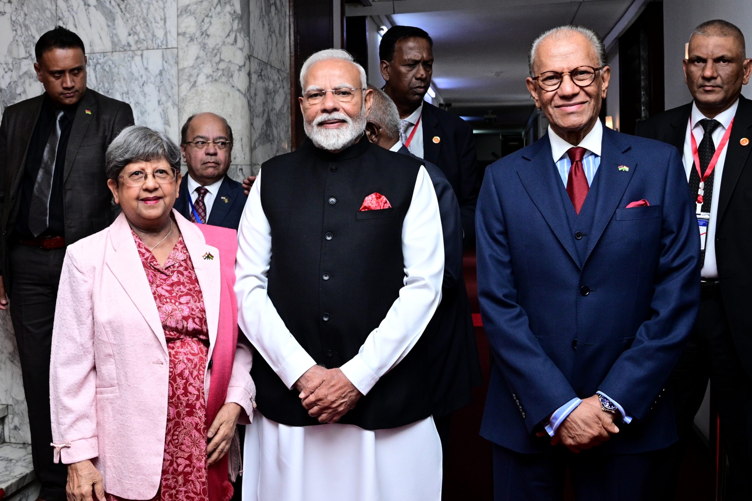 Honourable Shirin Aumeeruddy Cziffra, Speaker of the National Assembly, welcoming His Excellency Shri Narendra Modi, Prime Minister of the Republic of India on 11 March during his official visit to Mauritius from 11-12 March 2025